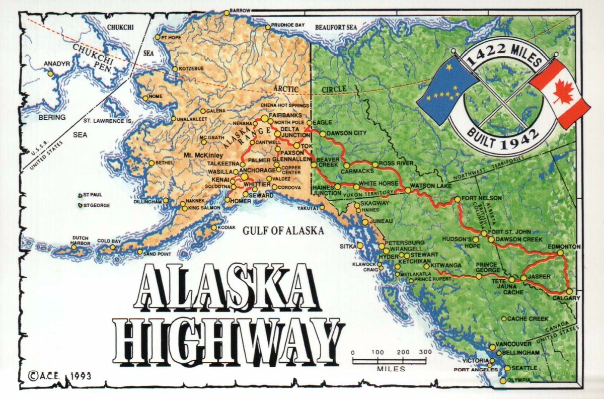 Alaska Highway State Map, Juneau, Anchorage, Fairbanks etc, Canada